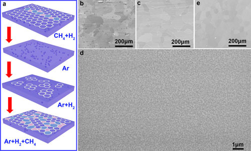晶界是化学气相沉积(CVD)方法制备的大面积石墨烯薄膜中普遍存在的缺陷。深入理解晶界对石墨烯的电学和热学性质的影响对发展基于石墨烯的电子、光电和热电器件具有重要意义。尽管目前对于单个晶界对石墨烯性质影响的研究较多,但宏观尺度上晶粒尺寸对石墨烯电学和热学性质的影响尚不清楚。其主要原因是基于传统的析出(镍基体)或表面吸附生长(铜基体)机制的CVD生长方法无法在大范围内调控石墨烯的晶粒尺寸,制备晶粒尺寸小于电子和声子平均自由程(约1微米)的小晶粒石墨烯尤为困难。