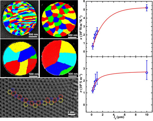 图2 采用“析出-表面吸附生长”CVD方法制备的晶粒尺寸均一可调的高质量多晶石墨烯薄膜及晶粒尺寸对石墨烯热导率和电导率的影响