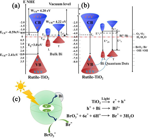 图1 (a)块体Bi/TiO2 (rutile)与(b)纳米Bi/TiO2 (rutile)复合光催化材料能带结构对比示意图。(c)纳米Bi/TiO2 (rutile)复合光催化材料光催化还原溴酸根原理图。