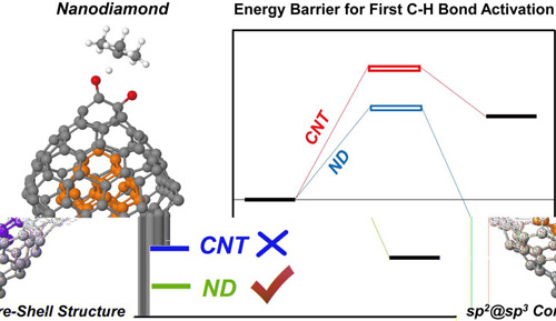 纳米金刚石在烷烃直接脱氢反应中表现出优异的催化效果,不仅仅超过传统金属催化剂,而且相对于其他纳米碳材料催化剂例如碳纳米管也具有更好的稳定性和选择性。通过第一性原理计算,研究人员从催化剂结构、碳氢键活化能垒、电荷转移以及尺寸效应等几个方面揭示了纳米金刚石独特的sp2@sp3核壳结构与催化性能之间的构效关系,为进一步设计和优化非金属纳米碳材料催化剂提供了理论支持(ACS Catalysis 2017, 7, 3779-3785.)。