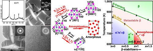 在研究直接凝固(Ti0.615Zr0.385)100-3.9x(Cu2.3Fe1.6)(x=1)合金的相变过程中,研究人员发现亚稳β相晶粒内部分布着具有特定取向的柳叶状或者板条状非晶相(见图),非晶相和β相基体无明显成分差别,并且在界面处存在明显的切变台阶以及严重的β相晶格畸变。这种非晶相的形态与已报道的固态非晶化明显不同。提出了一种“马氏体相变致非晶化”机制:亚稳β型(Ti0.615Zr0.385)100-3.9x(Cu2.3Fe1.6)(x=1)合金在冷却过程中,高温稳定的体心立方结构变得不再稳定,出现两种声子软化模式:T1 1/2 (1,1,0)和L 2/3 (1,1,1)。前者导致β相转变为α'/α''马氏体,后者导致晶面{222}β部分移位形成ω相。而对于特定成分的β钛合金,马氏体相变过程中的局域晶格切变和畸变使得结构无序的非晶相相对于晶态α'/α''/ω相更容易形成,导致马氏体非晶化的出现(见图)。这种非晶相可被称为“非晶马氏体”。这一发现丰富了固态非晶化机制和马氏体相变理论。