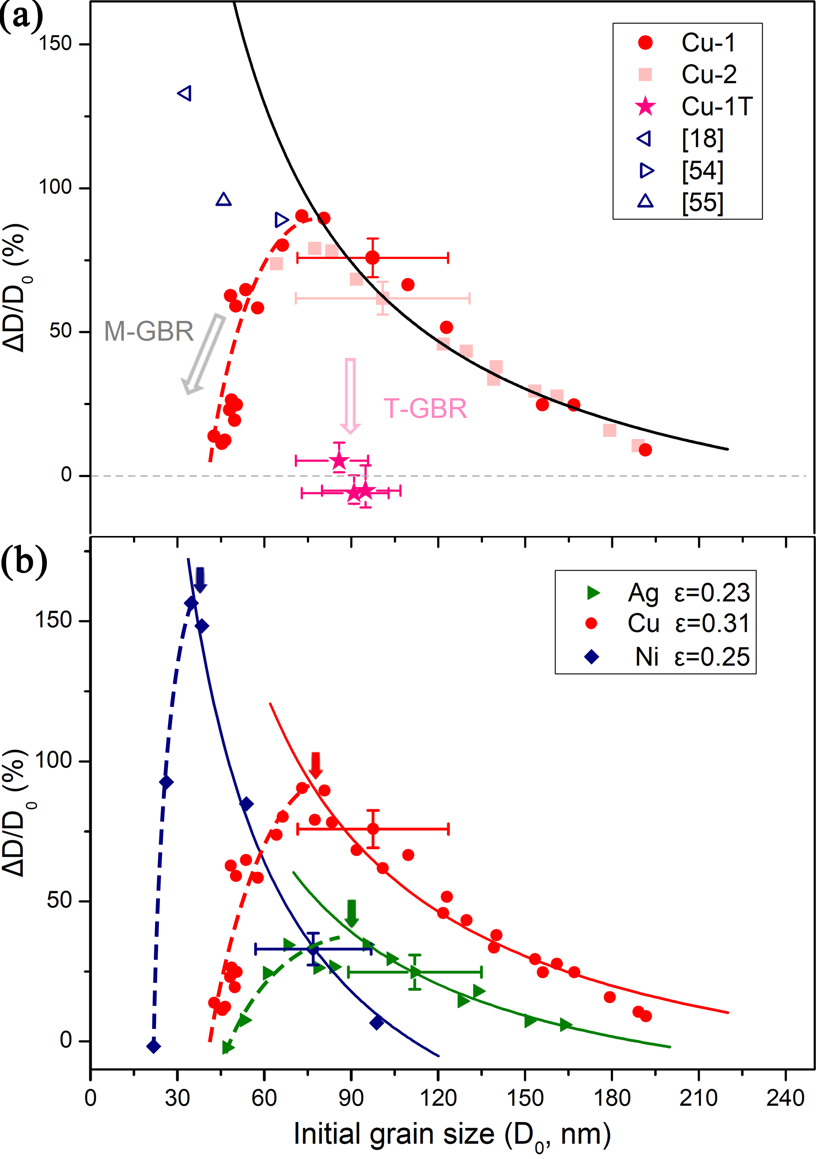 Figure (a) Variations of the measured relative grain size change (Δ𝐷/𝐷0) as a function of initial grain size (𝐷0) for Cu after tension. M-GBR and T-GBR represent mechanical-induce and thermal-induce GB relaxation effects. (b) Variations ofD𝐷/𝐷0as a function of 𝐷for Ag (strain: 0.23), Cu (strain: 0.31), and Ni (strain: 0.25), respectively.