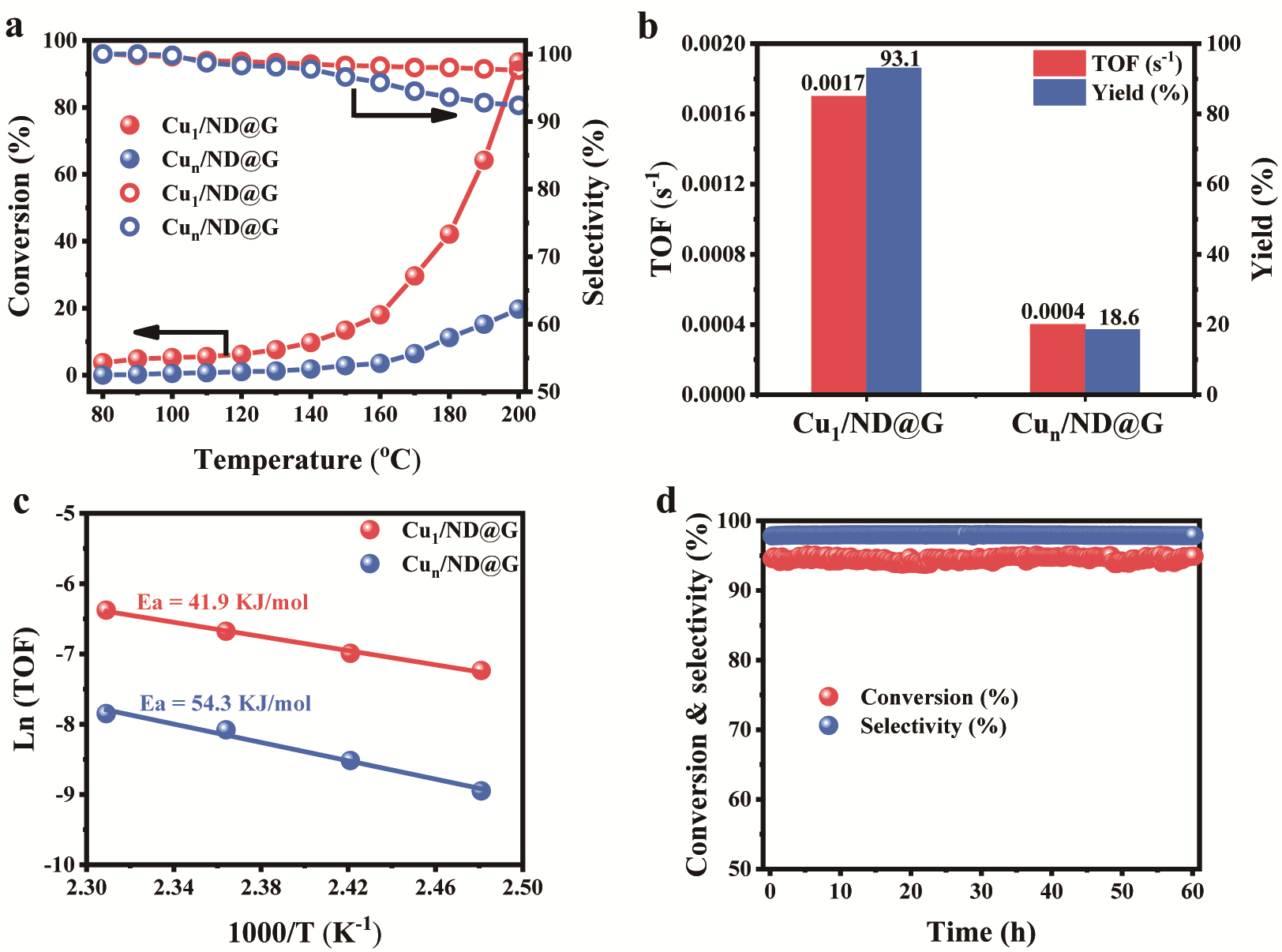 图3催化剂加氢催化活性。(原子级分散Cu1/ND@G具有更低的乙炔加氢活化能垒,转化频率(TOF)高于Cu团簇催化剂(Cun/ND@G)4倍以上,且在60h反应稳定性测试中表现优异。)