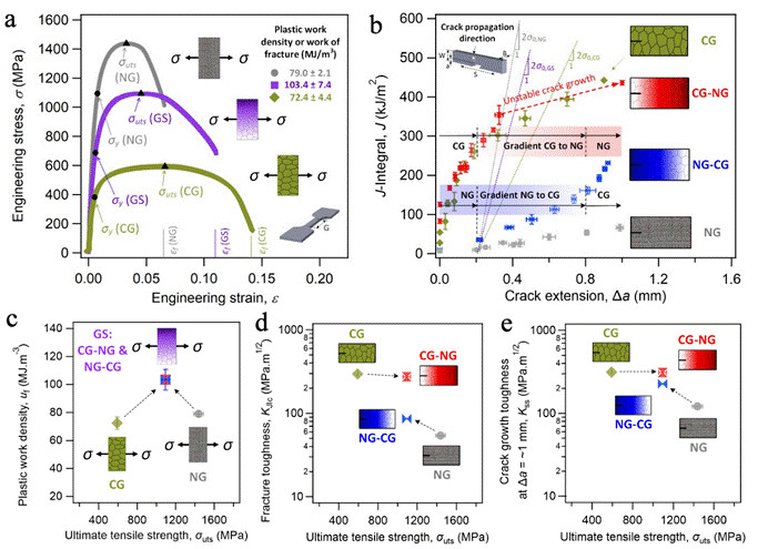 图1:粗晶,纳米晶,粗晶→纳米晶梯度结构,以及纳米晶→粗晶梯度结构金属Ni的力学性能。(a)拉伸应力-应变曲线;(b)断裂韧性J值和裂纹扩展长度Δa的关系图;(c)拉伸时抗拉强度 vs. 塑性应变能;(d) 抗拉强度 vs. 断裂韧性值;(e) 抗拉强度 vs. Δa=~ 1 mm时的断裂韧性。