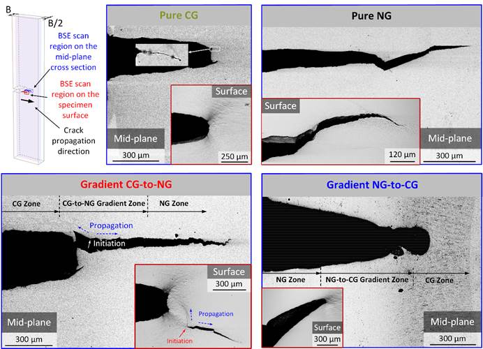 图2:粗晶(CG),纳米晶(NG),粗晶→纳米晶梯度结构(CG→NG),以及纳米晶→粗晶梯度结构(NG→CG)金属Ni的裂纹扩展行为