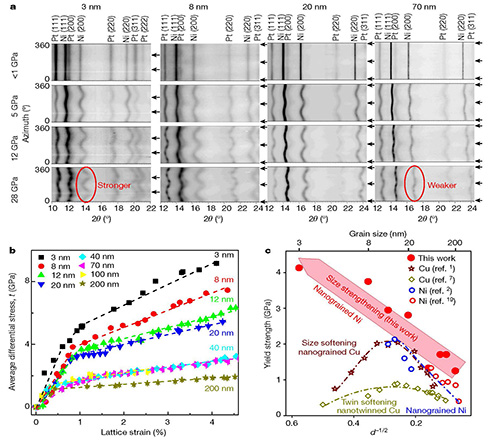 在本研究工作中,研究人员首次将地球科学研究领域的高压实验方法引入到了纳米材料研究中,采用高压径向X射线衍射的方法测量纳米金属高压下的弹性及塑性形变,创造性地解决了纳米材料强度表征的技术难题,并首次报道了晶粒尺寸在10纳米以下的纳米纯金属的强化现象。系列径向高压X射线衍射测量表明压缩下的金属镍从200纳米到最小尺寸3纳米,其强度随着晶粒尺寸的减小呈现持续增加的现象,特别是晶粒尺寸从20纳米至3纳米的金属镍的强度增加尤为显著,并且在3纳米金属镍样品中获得了4.2 GPa的超高屈服强度,比常规商业纯镍强度提高了10倍。塑性计算模拟和透射电子显微镜分析表明,当晶粒尺寸小于20纳米以下时样品中出现了大量偏位错,有效抑制了高压下的晶界塑性形变,同时偏位错在晶粒内反应形成不可动的位错结构,从而可提高位错在晶粒内的储存能力,从而导致高压细晶强化。此外,研究团队在金属金和钯中也观测到了类似的强化现象。