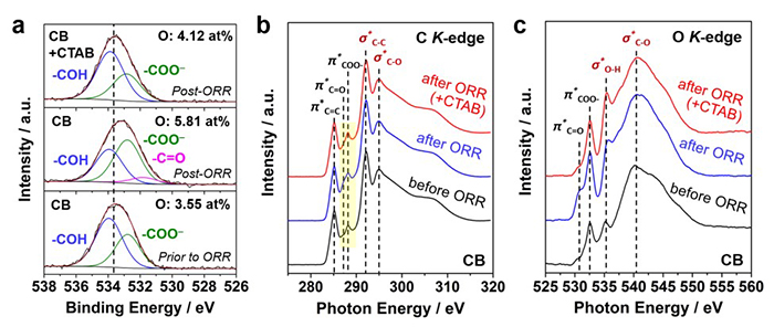 图4,反应前后碳/表面活性剂体系的化学组成和结构:XPS O1s谱和NEXAFS C/O的K-edge谱。