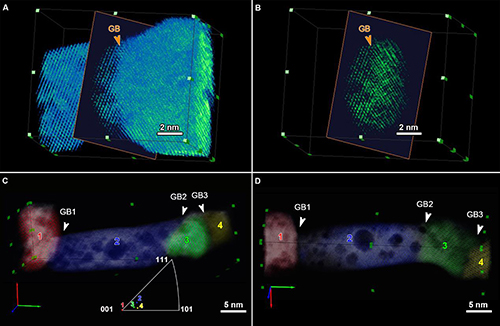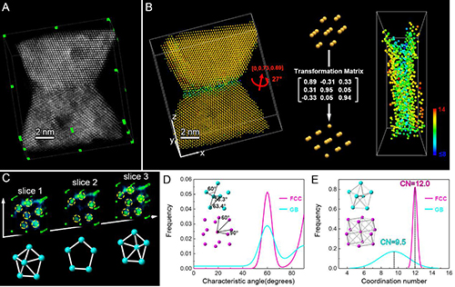 图1 双晶及多晶金属的原子分辨率电子层析三维重构。