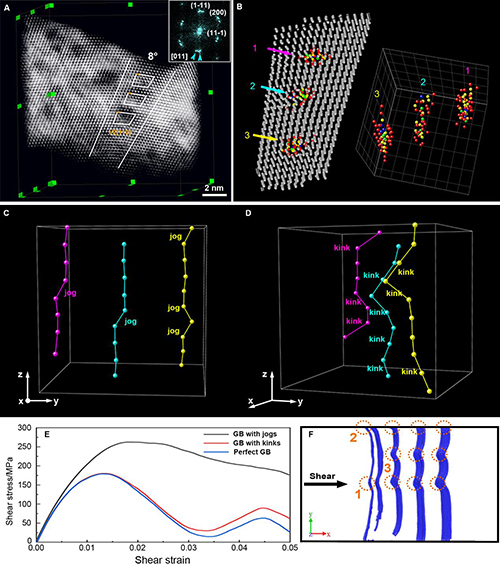 图3 小角晶界(位错型晶界)的三维原子结构、晶界位错的扭折和割阶组态及行为。