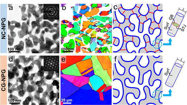 图1:纳米晶纳米多孔金的a ) TEM图像和选区电子衍射( SAED )图案,b ) PED取向图及c )结构示意图。粗晶纳米多孔金d ) TEM图像和SAED图案,e ) EBSD取向图及f ) 结构示意图。Surf:固体表面。GB:晶界。STJ:表面-晶界截交线。
