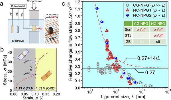 图2:a)电化学控制原位压缩实验装置示意图,b)典型的纳米晶纳米多孔金随表面状态改变的原位压缩曲线,c)纳米晶和粗晶纳米多孔金氧吸附产生的流变应力变化幅度随孔棱尺寸的变化规律。