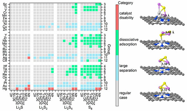 锂硫电池的高能量密度,使它成为下一代储能技术的有力候选者。其正负极的主要活性物质分别是硫和锂。在充放电过程中会形成可溶的高阶多硫化物从正极扩散至负极,导致正极活性物质的流失以及负极的失活,即所谓的“穿梭效应”。另一方面,正极处缓慢的硫还原动力学也限制了锂硫电池的性能。近年来,有关研究发现应用在锂硫电池正极材料中的负载型单原子催化剂可以抑制穿梭效应以及加快硫还原反应动力学。然而,单原子催化剂的结构种类繁多,超出了传统的“试错法”或常规DFT计算的能力,急需进行系统研究。