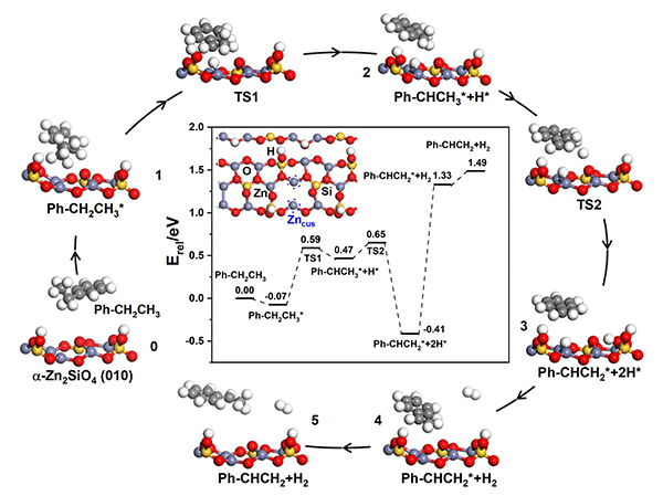 然而,负载型贵金属催化剂通常在反应条件苛刻的烷烃脱氢反应中稳定性较差,其活性中心的结构在反应中可能会发生变化,也难以控制载体上的金属物种在氧化重生后的结构,从而影响催化性能。构筑具有强键合能力的配位环境是增强烷烃脱氢金属催化材料稳定性的有效手段。尽管金属氧化物催化剂通常比负载型金属催化剂具有更稳定的配位环境,但其在烷烃脱氢反应中的活性较差。由于单个活性位的脱氢效率有限,为提高催化剂烷烃脱氢效率,该工作通过优化合成方法,研发了表面具有高密度配位不饱和结构的Zn催化剂,利用O的配位作用将Zn禁锢于硅酸锌骨架中,形成稳定结构。XRD、吡啶红外吸附、球差电镜表征结果说明HD-Zncus@ZS催化剂的成功制备及其表面配位不饱和Zn(Zncus)结构的存在(图1)。乙苯脱氢测试说明具有高密度Zncus的HD-Zncus@ZS催化剂本征脱氢活性更高,在5次氧化再生循环反应中具有良好的稳定性(图2)。密度泛函理论计算探究了乙苯分子在高密度配位不饱和Zn 物种上的脱氢路径(图3)。该项研究工作为设计新型高活性、高稳定性且低成本的烷烃脱氢催化剂提供理论指导。