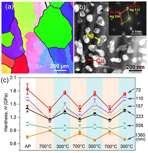 图2仿调幅分解结构Cu/Ag合金的微观组织及硬度的往复调节。制备态Cu/Ag合金的(a)EBSD和(b)STEM图像;(c)不同结构尺寸Cu/Ag合金硬度随退火温度的循环变化。