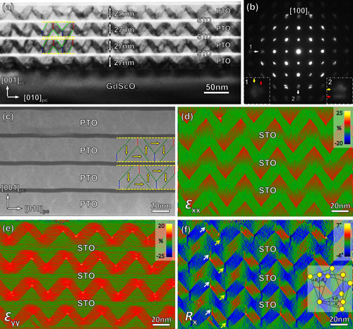 图1、相邻PTO层的厚度比为1的PTO/STO多层薄膜的像差校正透射电子显微分析。各PTO层中均出现周期性V畴阵列,且在垂直薄膜方向上也呈现周期性。(a-c)PTO/STO多层膜的低倍TEM 明场像(a),电子衍射谱(b),和高倍HAADF-STEM像(c);(d-f)是对图(c)进行几何相位分析得到的面内晶格应变(d),面外晶格应变(e)以及面内晶格旋转(f)二维分布图。