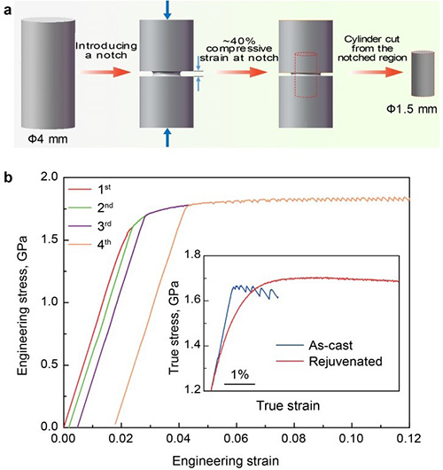 图1 (a)利用三维压应力的方法使块体非晶合金产生大范围、高程度的回春,获得高能态的块体非晶合金;(b)回春态块体非晶合金在单轴压缩时的加载-卸载-再加载曲线和真实应力-应变曲线(插图)。