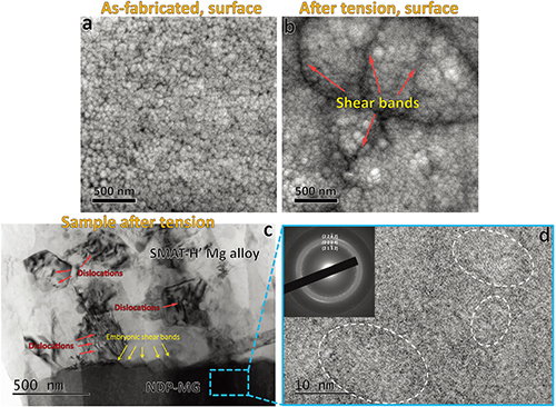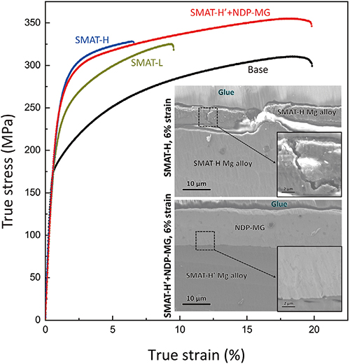 图3.双相金属玻璃+SMAT(NDP-MG coated SMAT-H′)镁合金室温力学性能。