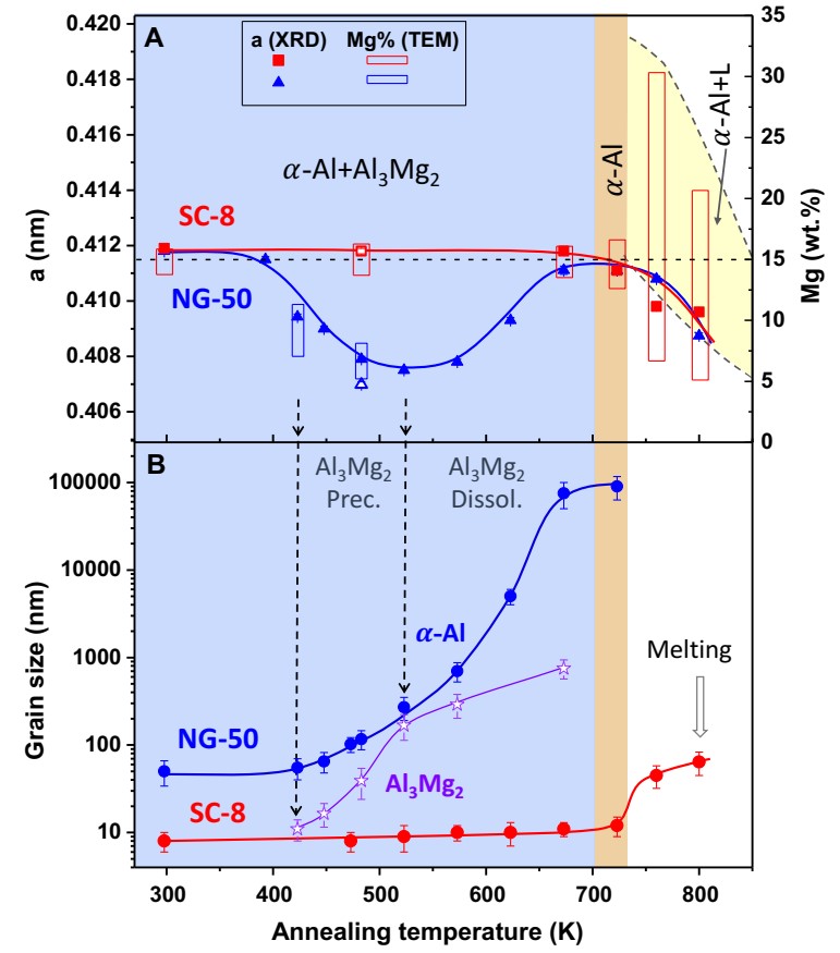 图2. Al-Mg合金受限晶体的(SC-8)晶格常数、晶格中镁含量及晶粒尺寸随退火温度的变化。