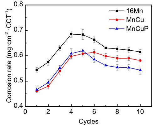 图1. MnCuP耐候钢、MnCu耐候钢与16Mn钢在大气腐蚀初期的腐蚀速率演变规律