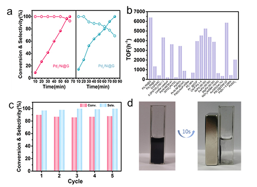 图2. (a-c)Pd1/Ni@G在苯乙炔选择性加氢反应中的催化性能;(d)催化剂磁可分示意图。