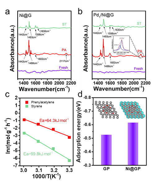 图3.(a-b)Ni@G、Pd1/Ni@G的红外光谱;(c)Pd1/Ni@G对苯乙炔半加氢和苯乙烯加氢的动力学测试;(d)苯乙炔在石墨烯(GP)和石墨烯包覆镍(Ni@GP)上吸附能计算。