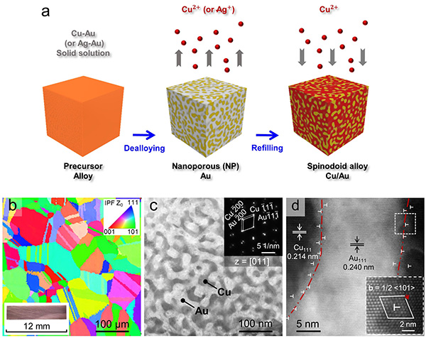 图1. 仿调幅分解结构Cu/Au合金的制备及结构特征。a) 脱合金与电沉积结合形成仿调幅分解结构的示意图。b)EBSD照片显示该材料粗大的晶粒尺寸,c)TEM照片显示其双连续纳米双相结构,以及d)HRTEM照片显示半共格界面和高密度失配位错。