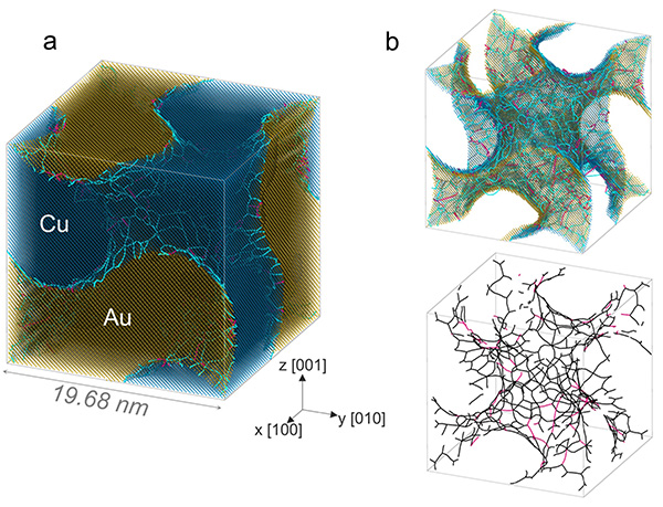 图2. 仿调幅分解结构Cu/Au合金的分子动力学模拟。a)典型 Gyroid双相结构及其光滑连续半共格界面,以及b)界面上大量失配位错组成的三维位错网络。