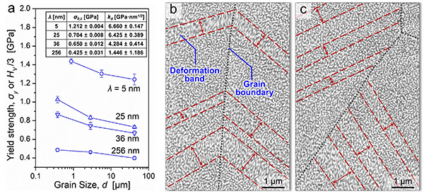 图4. 仿调幅分解结构Cu/Au合金屈服强度的晶粒尺寸效应。a)虽然该材料晶粒尺寸(d)比结构尺寸(λ)高几个数量级,其强度仍表现出显著的晶粒尺寸(d)效应。(b-c)SEM照片显示晶界对剪切带有明显的阻碍作用,与强度的晶粒尺寸效应相一致。