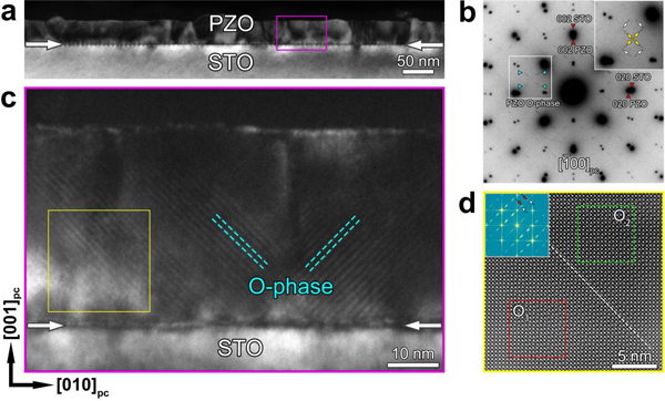 图2:外延PbZrO3薄膜的微观结构和相组成。(a) PbZrO3薄膜的大尺度暗场TEM图像; (b)选区电子衍射; (c)局部TEM暗场像; (d)原子尺度STEM图像。