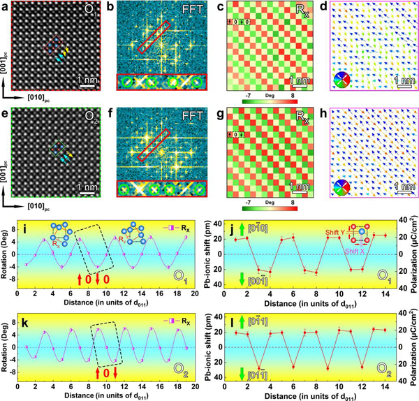 图3:PbZrO3薄膜中两种类型O相的原子结构分析。(a, b, c, d, i, j) AFE-like相的精细结构分析; (e, f, g, h, k, l) FiE-like相的精细结构分析。