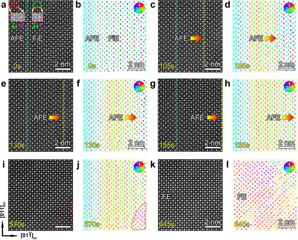 图4:电子束辐照下PbZrO3薄膜相界驱动的相变。(a, c, e, g, i, k)原子尺度HAADF-STEM图像; (b, d, f, h, j, l)相应的Pb2+位移映射。