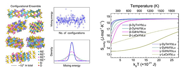 图3 (REI0.25REII0.25REIII0.25REIV0.25)2Si2O7晶体结构系综模型、亚稳构型形成能的分布,以及4种典型成分低膨胀系数β和γ晶型材料的构型熵。